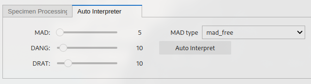 The “auto-interpret” tab. Can be used to set threshold values for MAD, DANG and DRAT for auto-interpreting the data. The “Auto-Interpret” button will find the temperature range which satisfies these criteria whilst maximizing the FRAC criterion. The “MAD type” dropdown lets you choose whether you want MAD to be calculated for all temperature steps (mad_free) or only the zero-field first temperature steps (mad_coe).