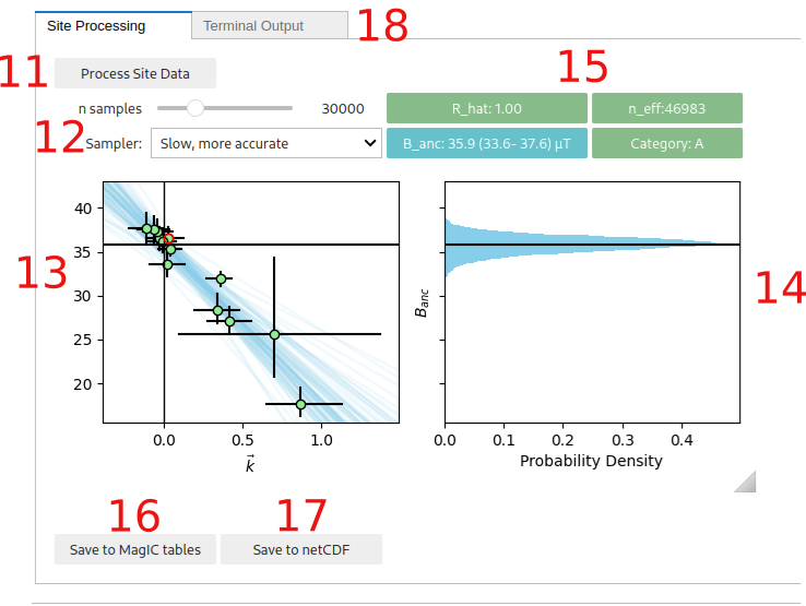 The “Process Site Data” button performs the BiCEP method on that site and calculates the site level paleointensity. Depending on the speed of your computer and the sampler parameters used (10), this may take a while to run, especially for sites with many specimens. Please be patient. Progress can be monitored using the “Terminal output” tab.
