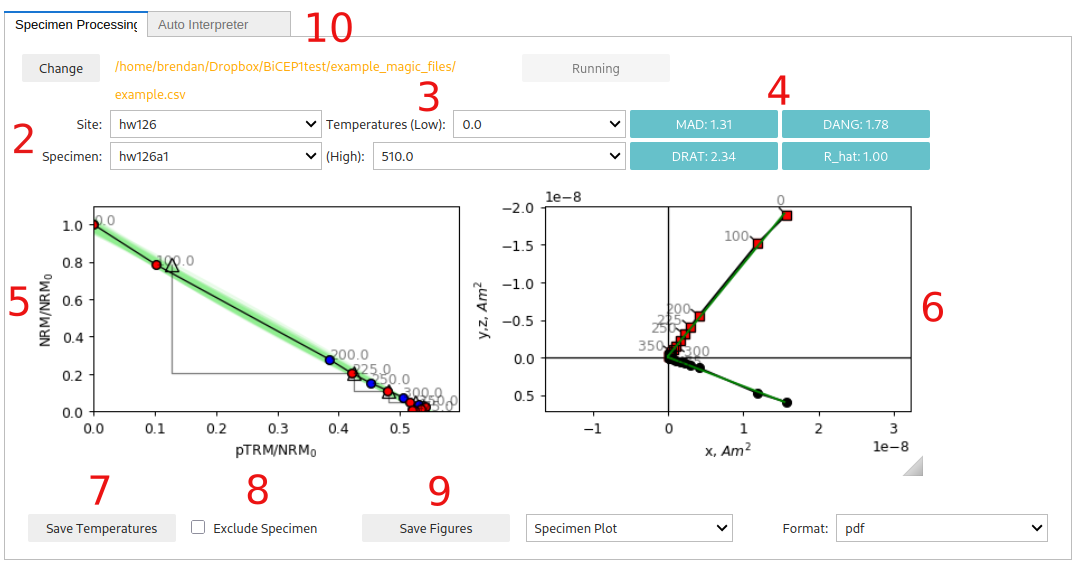 Saves the temperatures used for that specimen to a “BiCEP_gui.redo” file. This must be done for each specimen individually to change temperatures before running the sampler (9.). By default, all temperature steps are used for every specimen. However, the auto-interpreter tab can be used to automatically pick temperature ranges.
